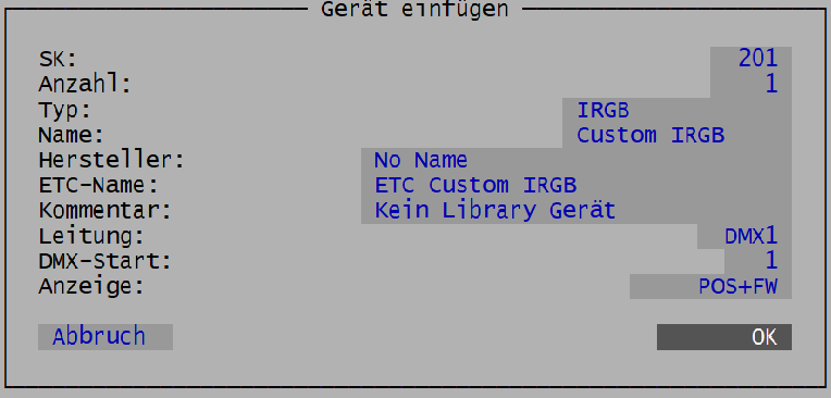 - Im darauf öffnenden Fenster die Felder ausfüllen; dabei zunächst "Anzahl = 1" stehen lassen. Die SK Nummer, DMX Start usw. kann beliebig gewählt werden. Mit {OK} beenden.